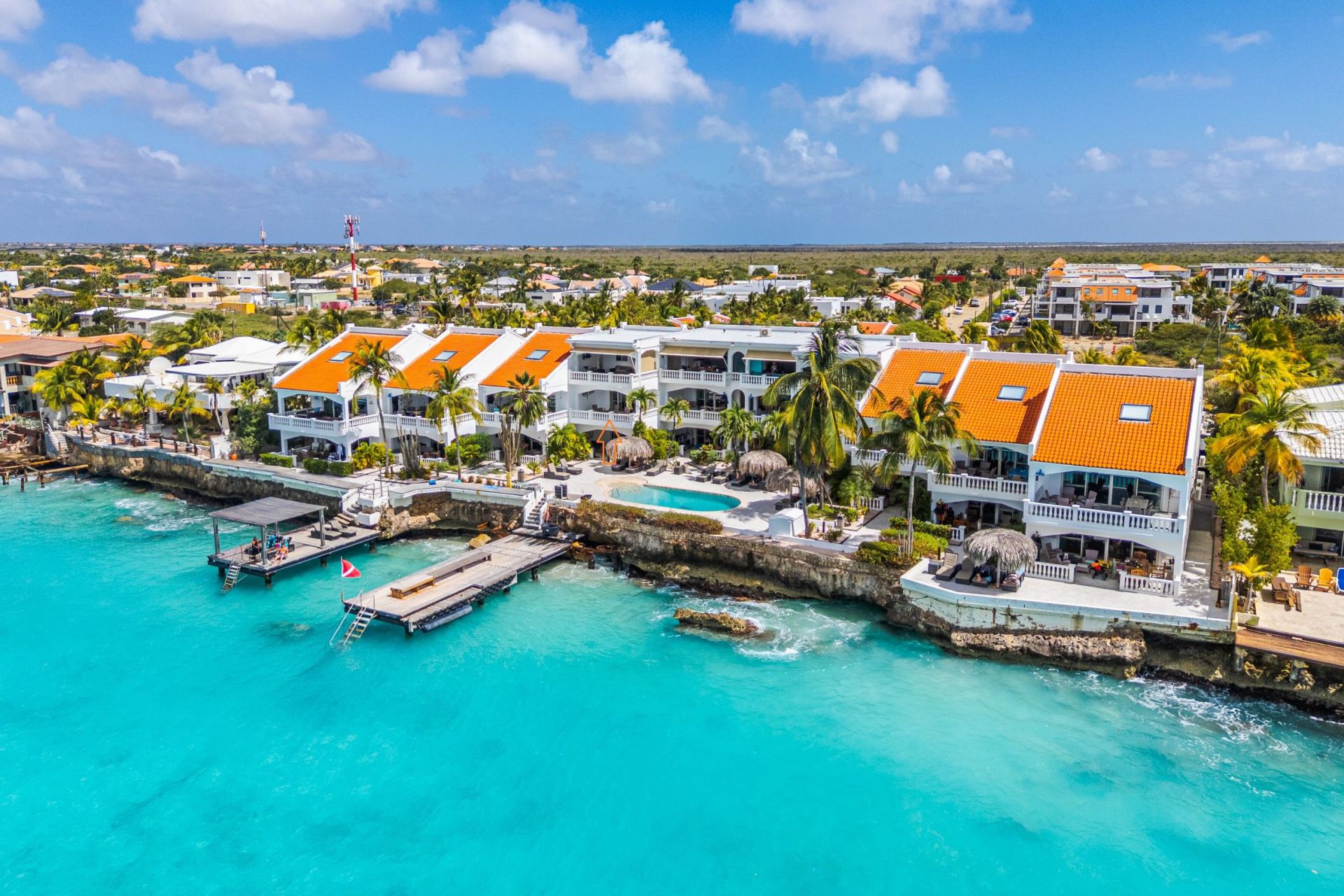 The apartment features a bright living room with an open-plan kitchen, creating a cozy and spacious living environment. The bedroom and well-kept bathroom complete the home, offering comfortable living for both private use and rental purposes. One of the absolute highlights is the generous covered terrace. Here, you can enjoy beautiful views over the communal swimming pool and the Caribbean Sea. The perfect place to peacefully wake up with a cup of coffee in the morning or unwind in the evening while watching the sunset. The complex also features a dive school and two piers providing easy access to the sea.