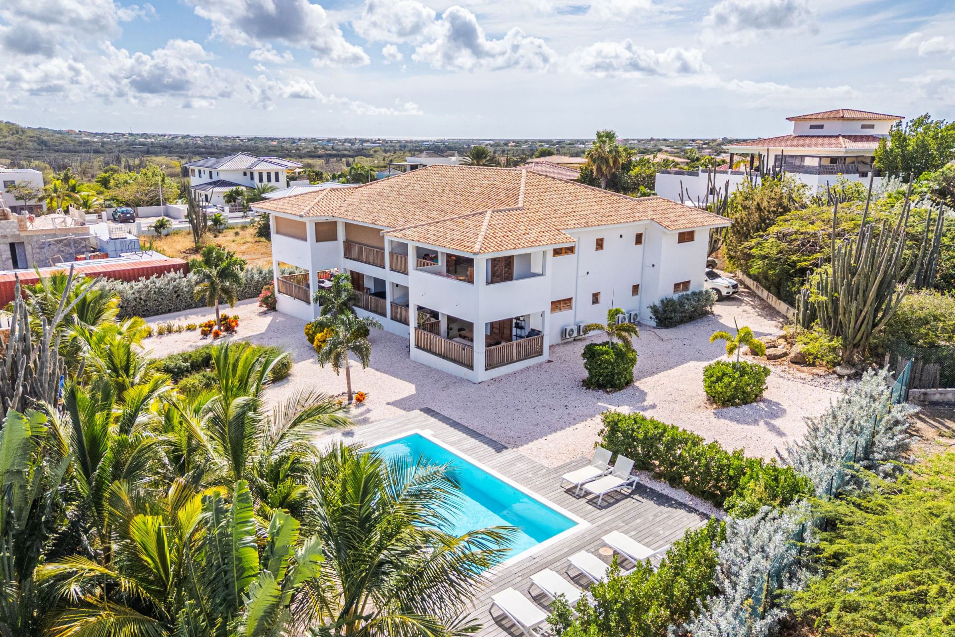 The apartment is situated on the first floor of a small-scale complex with a shared swimming pool—perfect for cooling off or enjoying social moments under the Bonaire sun. Inside, you’ll find two spacious bedrooms, each with its own en-suite bathroom. The open kitchen flows directly onto the large covered terrace, which is perfectly positioned to catch the breeze and offers peaceful views of the surrounding area—an ideal spot to relax. The use of natural materials combined with concrete-look elements gives the apartment a warm, timeless, and inviting atmosphere.