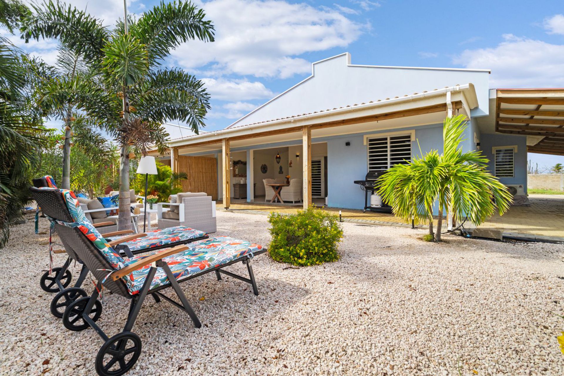 The house features three bedrooms, two of which include built-in closets and a private bathroom. The living room forms the heart of the home and includes a modern L-shaped kitchen equipped with various built-in appliances. From the living room, you can access the wide, covered terrace a wonderful place to enjoy the refreshing trade winds. There is also an indoor storage room, accessible from both the kitchen and the outside.