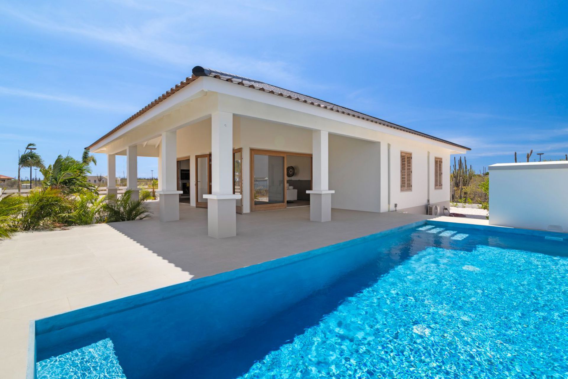 Upon entering, you will find a bright and spacious living room with an open-plan kitchen, fully equipped with high-quality built-in appliances. The villa features three comfortable bedrooms and two elegantly finished bathrooms. At the rear of the property, there is a generous covered terrace directly connected to the living room – the ideal place to enjoy the Caribbean outdoor lifestyle in complete tranquility. The beautifully landscaped garden offers a private swimming pool, an additional covered lounge area, and various tropical plants.