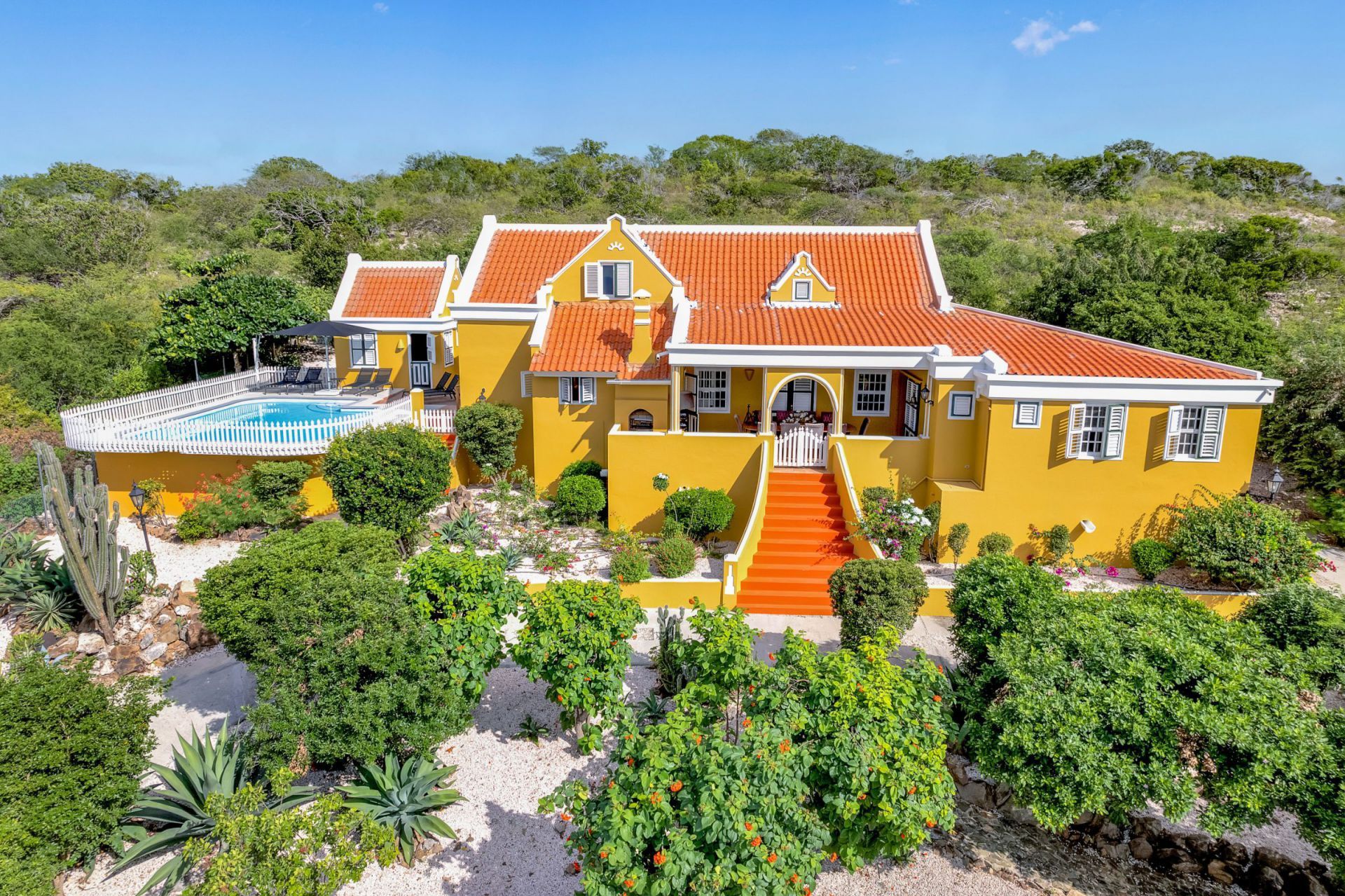 This impressive country house is located in the quiet neighborhood of Santa Barbara and offers breathtaking views of the ocean, Klein Bonaire and Curaçao. Kaya Turkesa 28 is accessible via a beautiful driveway that leads to the main building, where you are welcomed in the spacious living room. From the living room you have access to the covered terraces, the kitchen, the utility room, as well as the bedrooms with fitted wardrobes and a bathroom. Via a charming alley with Old Dutch paving you reach an outbuilding, which consists of three linked houses. Each house has one bedroom with fitted wardrobes, a bathroom and a loft. All bedrooms are equipped with air conditioning for optimal comfort.